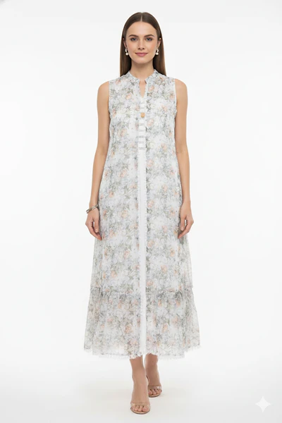 WOMEN COTTON FRONT OPEN CALF LENGTH SLEEVELESS KURTIS