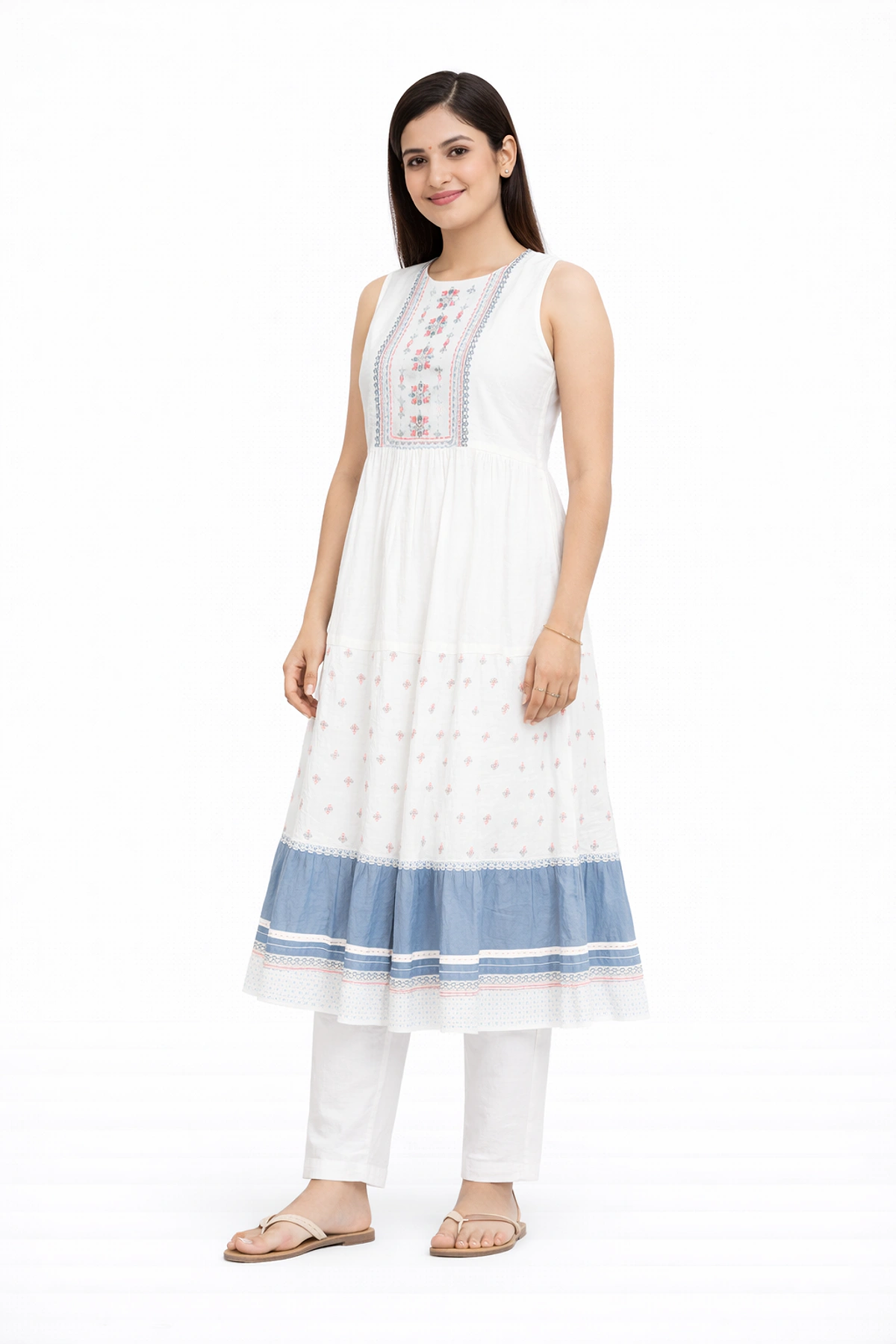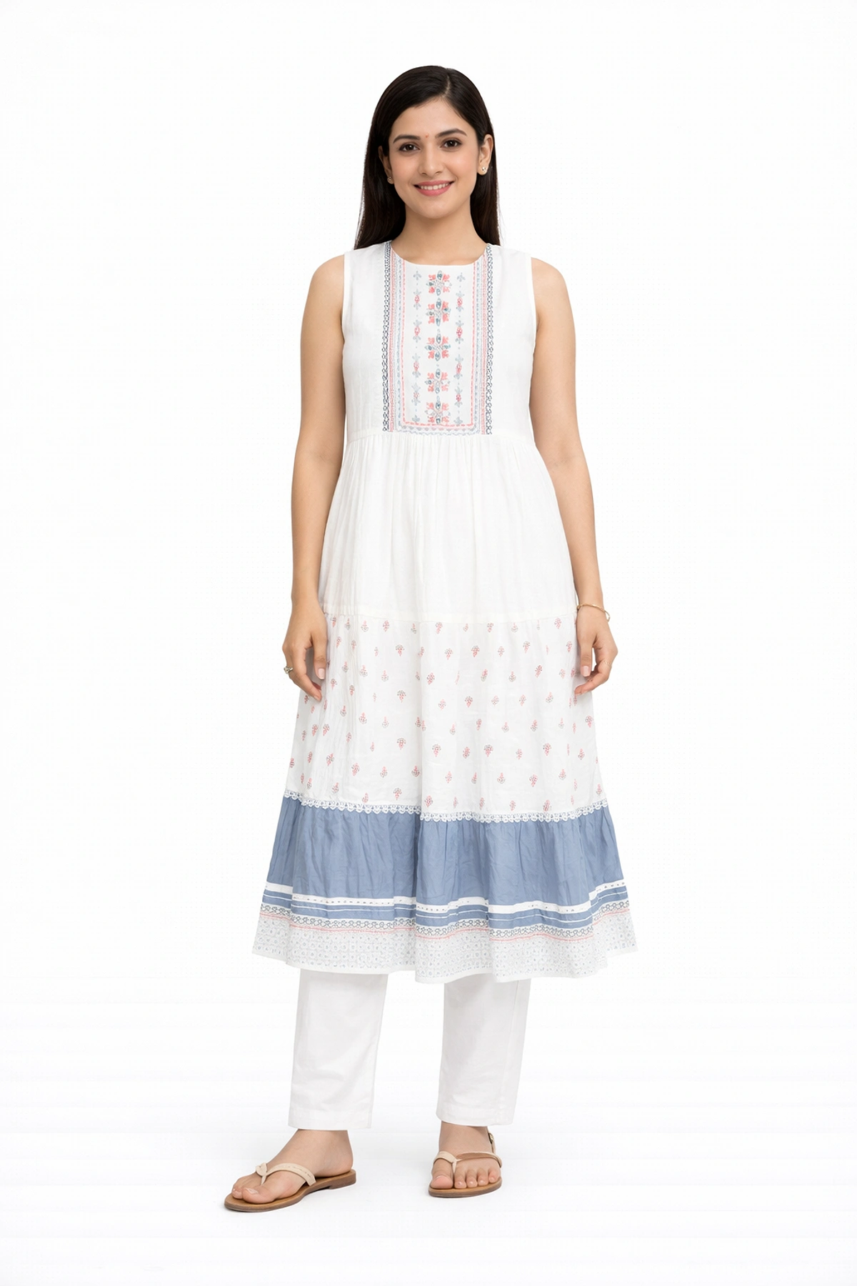 WOMEN COTTON TIERED ANKLE LENGTH SLEEVELESS KURTIS