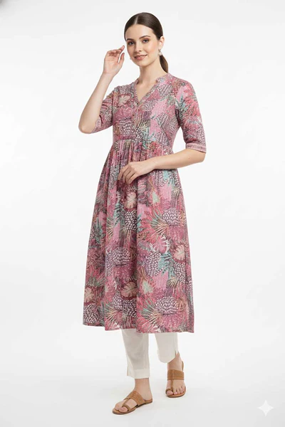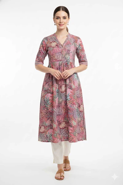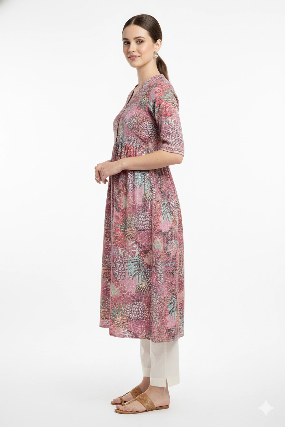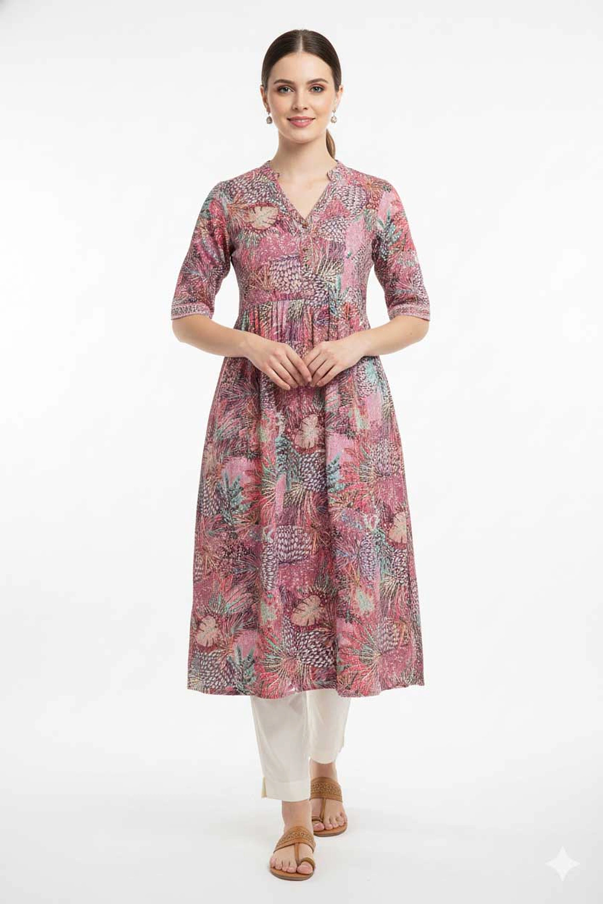 WOMEN SILK FLAREDÂ QUARTER SLEEVE KNEE LENGTH KURTIS