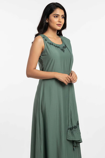 WOMEN SILK SOLID SLEEVELESS CALF LENTH KURTIS